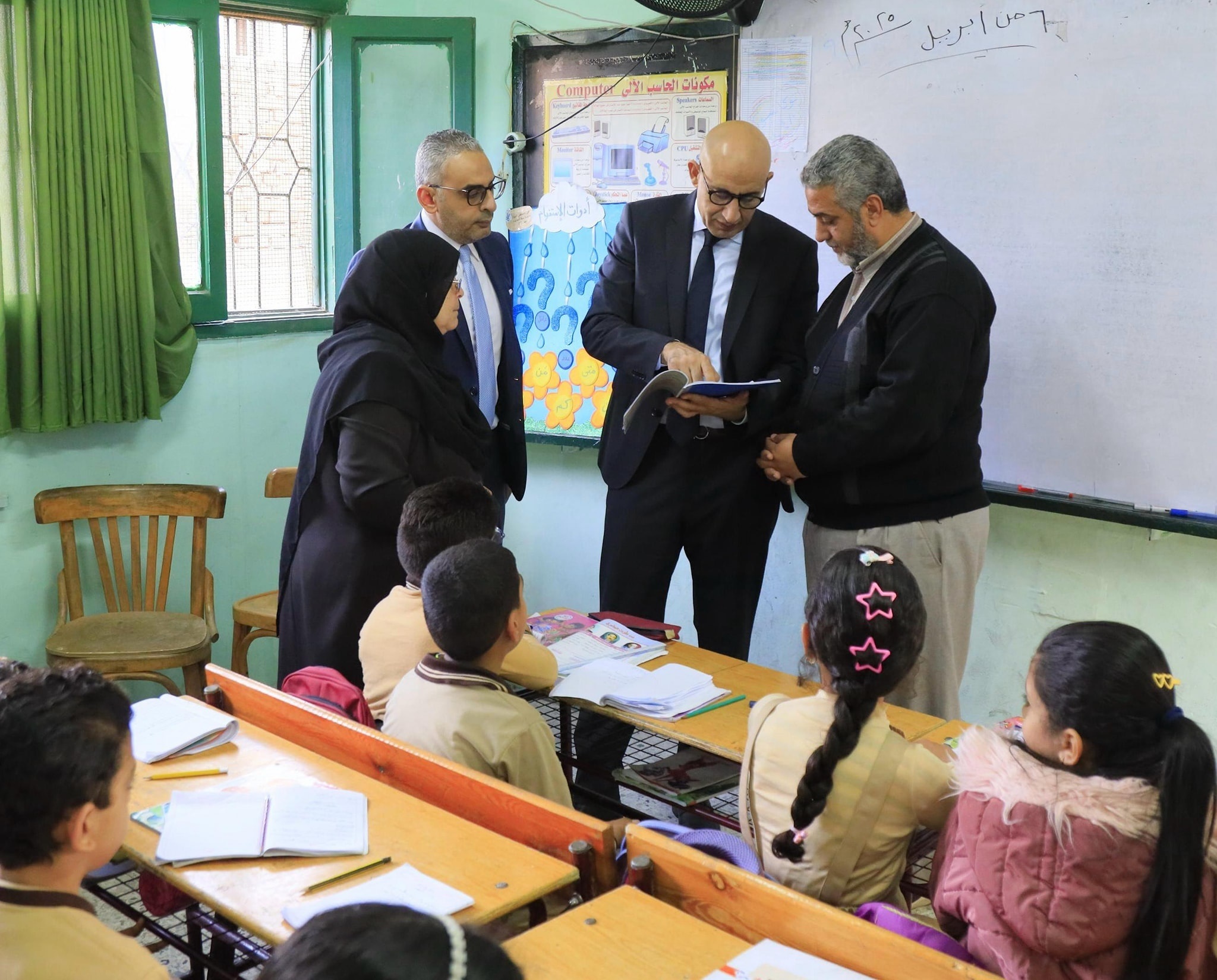 وتفقد الوزير عددًا من فصول الصفوف الابتدائية بالمدرسة واطلع على كراسات الواجب والحصة، كما اطلع على دفاتر المعلمين وسجلات الحضور والمواظبة ودرجات الطلاب.