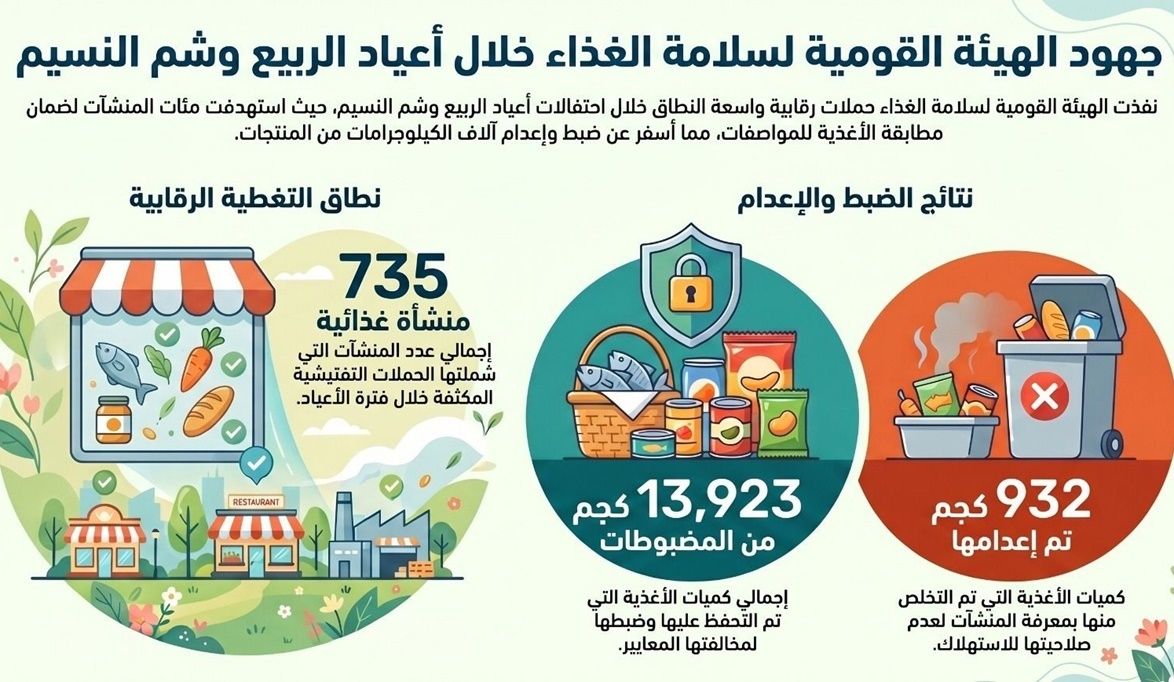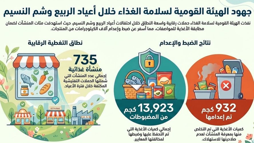 في إطار استعداداتها المكثفة لأعياد الربيع وشم النسيم، كثّفت الهيئة القومية لسلامة الغذاء حملاتها الرقابية على مستوى جميع محافظات الجمهورية خلال الفترة التي سبقت الأعياد، وذلك ضمن خطة استباقية تستهدف ضمان سلامة الغذاء، وتشديد الرقابة على تداول الأغذية، وحماية صحة المواطنين، لا سيما مع تزايد الإقبال على المنتجات الغذائية الموسمية، وعلى رأسها الأسماك المملحة والمدخنة.
