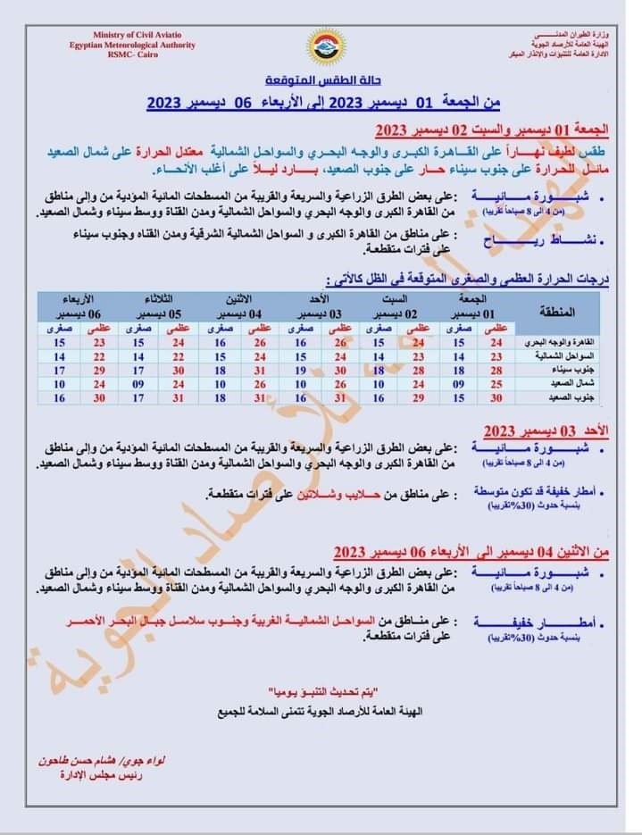 وتتوقع الأرصاد ان يشهد اليوم شبورة مائية كثيفة علي بعض الطرق الزراعية والسريعة والقريبة من المسطحات المائية المؤدية من وإلى مناطق من القاهرة الكبرى والوجه البحري والسواحل الشمالية ومدن القناة ووسط سيناء وشمال الصعيد ، مع وجود فرص أمطار خفيفة على مناطق متفرقة وفترات متقطعة على السواحل الشمالية.