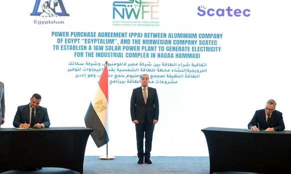 كما تضمنت التوقيعات التي شهدها رئيس الوزراء، توقيع اتفاقية بين شركة مصر للألومنيوم، وشركة سكاتك النرويجية، لشراء الطاقة وإنشاء محطة للطاقة الشمسية بقدرة 1 جيجاوات، بإجمالي استثمارات أجنبية مباشرة تبلغ 650 مليون دولار أمريكي، وذلك لتوفير الطاقة النظيفة لمجمع الألومنيوم بنجع حمادي، وهو أحد مشروعات محور الطاقة ببرنامج "نُوَفِّي".