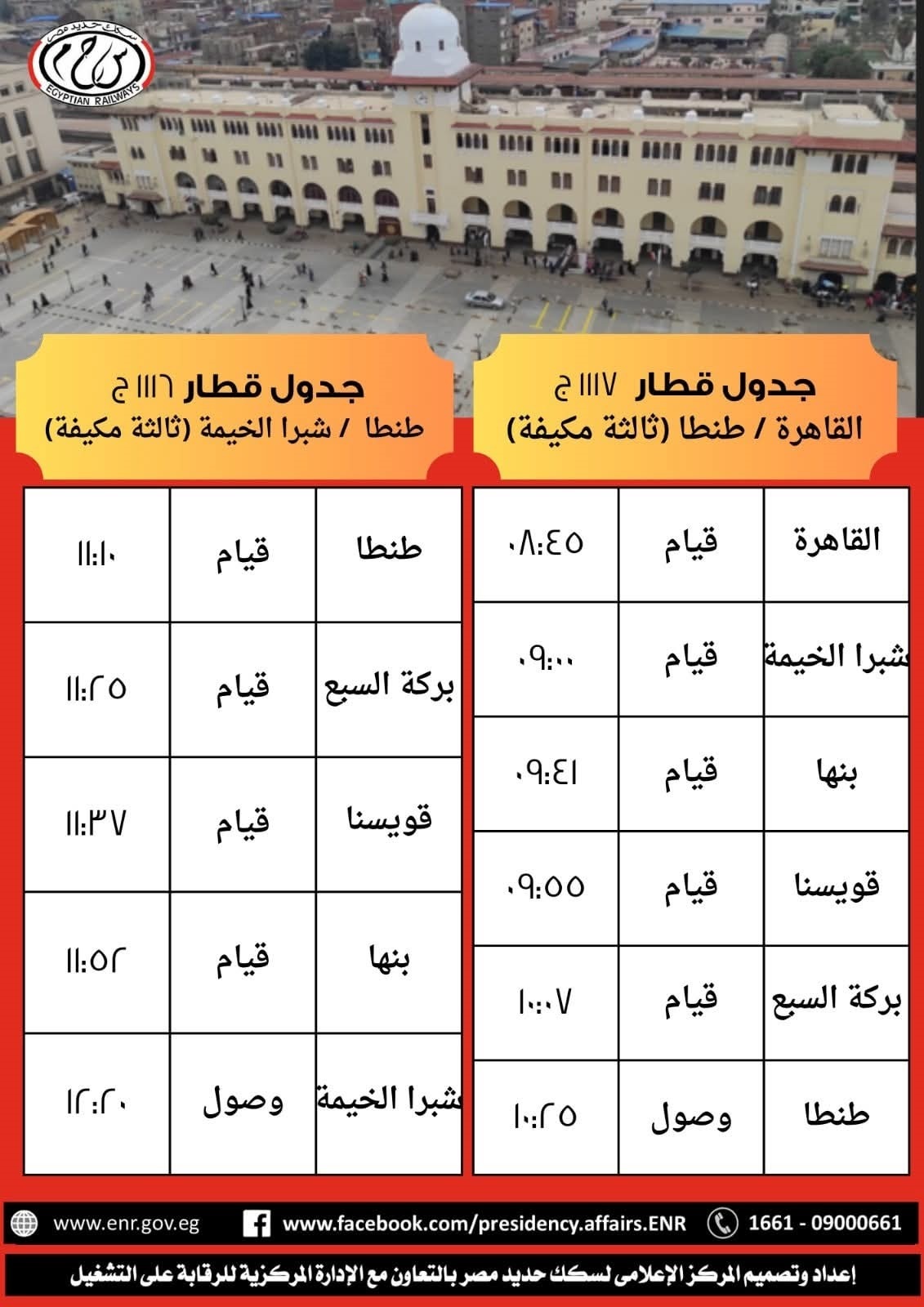 كما يقوم القطار رقم (1116) بعربات درجة ثالثة مكيفة من محطة طنطا الساعة 11:10 صباحًا، ويصل إلى محطة شبرا الخيمة الساعة 12:20 ظهرًا.