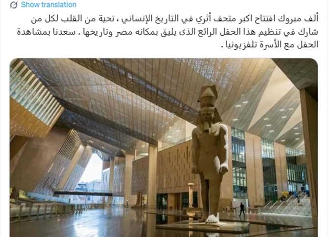 وكتب علاء مبارك عبر حسابه الرسمي على منصة إكس: «ألف مبروك افتتاح أكبر متحف أثري في التاريخ الإنساني، تحية من القلب لكل من شارك في تنظيم هذا الحفل الرائع الذي يليق بمكانة مصر وتاريخها. سعدنا بمشاهدة الحفل مع الأسرة تلفزيونيًا.