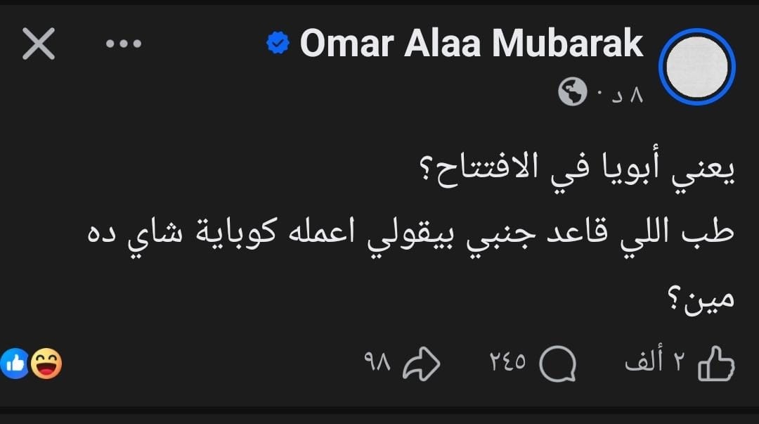 أما نجله عمر علاء مبارك، فأشعل الضحك بمنشور ساخر: «يعني أبويا في الافتتاح؟ طب اللي قاعد جنبي بيقولي اعمل كوباية شاي ده مين؟».