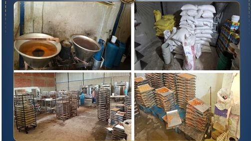 أسفرت عمليات الضبط عن وجود:6,355 طن دقيق، سكر، عسل جلوكوز، زبدة، مسلى، زيت طعام، ألوان صناعية بدون مستندات تثبت مصدرها.
