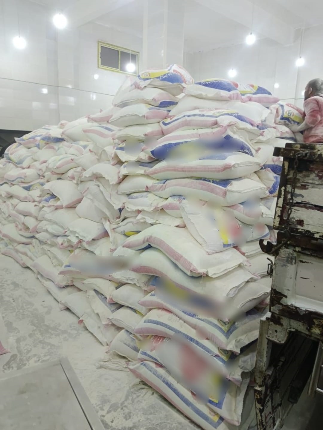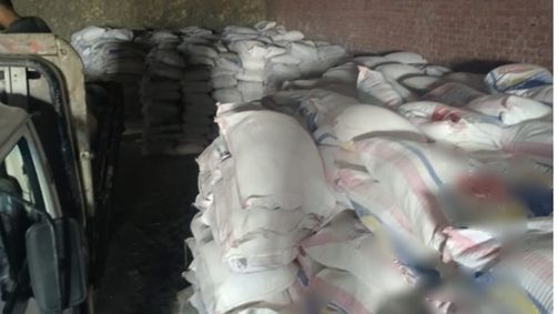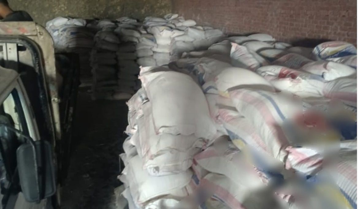 - ضبط مخزن غير مرخص داخل مزرعة بمدينة العاشر من رمضان يحتوي على ( ١٤٢٠) شيكارة دقيق فاخر استخراج 72% بإجمالي (٧١ طن) مجهول المصدر بدون فواتير أو بيانات توضح مصدر الحيازة.