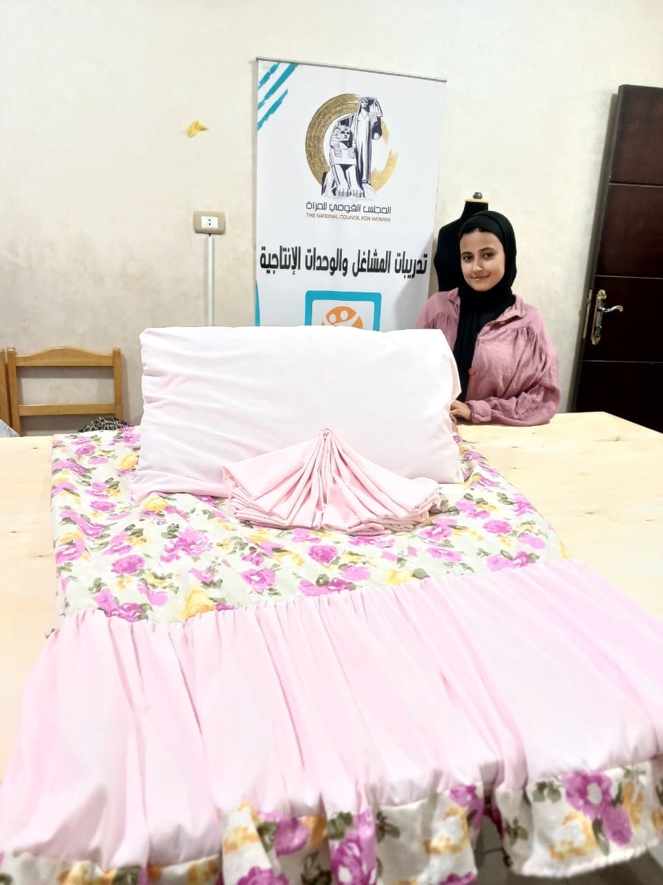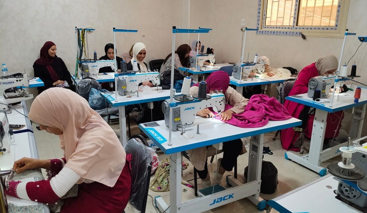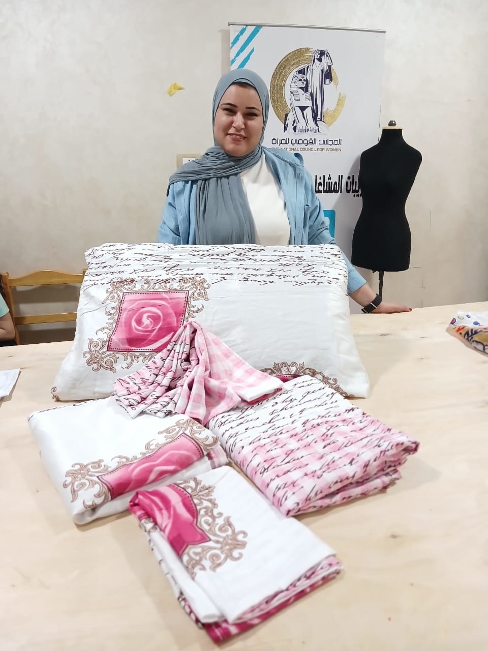 وبلغ عدد السيدات المستفيدات 570 سيدة ، تم تدريبهن وتأهيلهن لسوق العمل على إنتاج (المفروشات ـ الملابس الجاهزة ـ الزيوت العطرية).