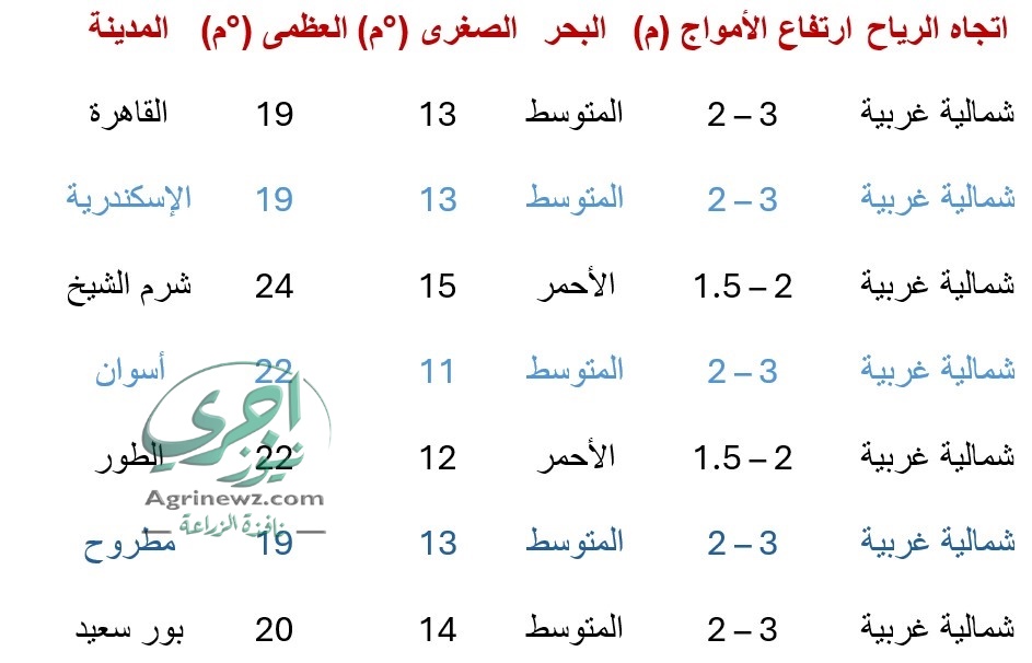 البحر المتوسط: معتدل إلى مضطرب على مناطق السلوم، مطروح، العلمين، الإسكندرية، بلطيم، مع ارتفاع الأمواج من 2 إلى 3 أمتار وسرعات رياح من 40 إلى 50 كم/س البحر الأحمر: معتدل، مع أمواج تتراوح بين 1.5 إلى 2 متر واتجاه الرياح شمالية غربية وقد دعت الهيئة البحارة إلى توخي الحذر بسبب اضطراب الملاحة البحرية في هذه المناطق.تحذيرات هامة من الهيئة العامة للأرصاد