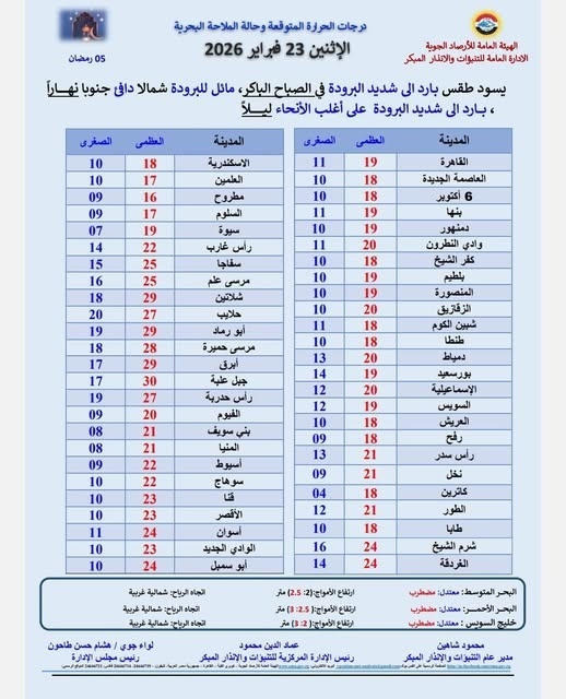 إلى 24 درجة.كما توقعت الهيئة استمرار نشاط الرياح خلال الفترة من الثلاثاء 24 فبراير وحتى الجمعة 27 فبراير على فترات متقطعة، ما يتطلب توخي الحذر خاصة في المناطق المكشوفة والطرق الصحراوية.