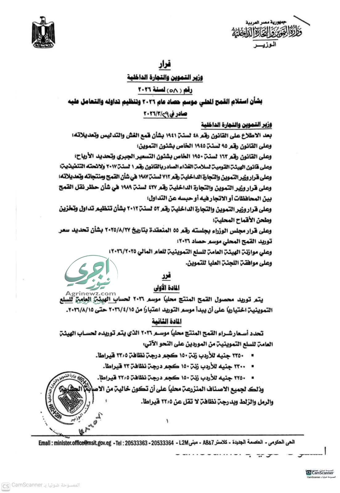 قرار مجلس الوزراء رقم 55 بتاريخ 27 أغسطس 2025 بشأن تحديد سعر توريد القمح المحلي لموسم 2026.