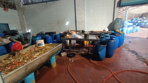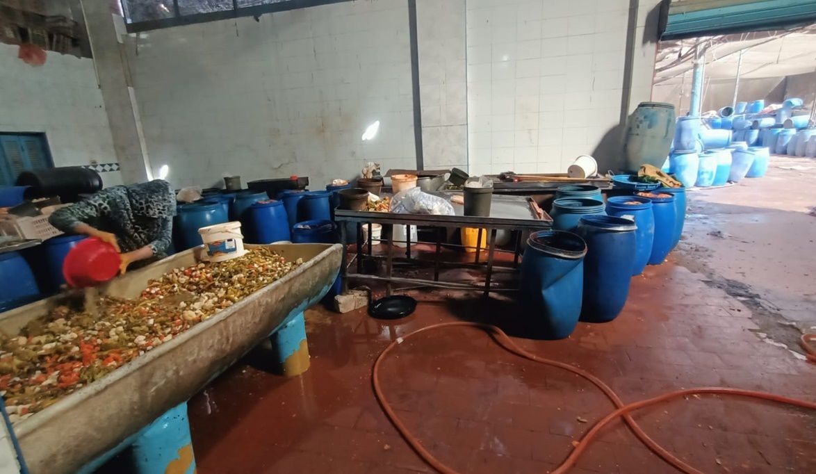 300 طن مخللات تحت التجهيز، معبأة وغير مدون عليها بيانات، تظهر عليها علامات تعفن وغير صالحة للاستهلاك.