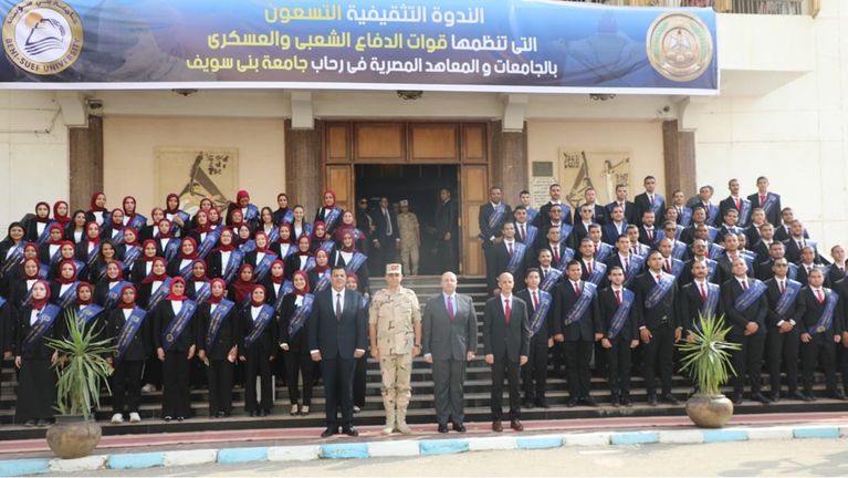 شهد الدكتور محمد هاني غنيم محافظ بني سويف،فعاليات الندوة التثقيفية التسعين التي نظمتها قوات الدفاع الشعبي والعسكري بالقوات المسلحة المصرية بقاعة الاحتفالات الكبري بجامعة بني سويف،بالتعاون مع مكتب المستشار العسكرى للمحافظة، وبحضور حرب هشام حسني حسن قائد قوات الدفاع الشعبي والعسكري، الدكتور طارق علي رئيس جامعة بني سويف، العميد محمد برعي عبد المجيد المستشار العسكري للمحافظة.الدكتور جان هنري حنا رئيس جامعة بني سويف التكنولوجية،وعدد من رجال الدين وعدد من التنفيذيين المعنيين، وطلاب الجامعة وبعض أهالي وأسر شهداء القوات المسلحة وذوي الهمم.