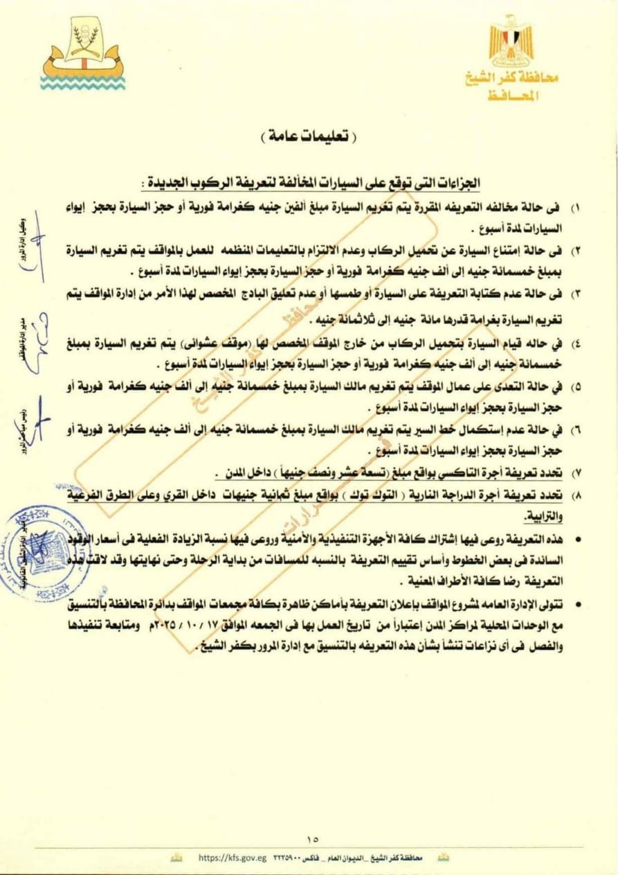 كلف محافظ كفرالشيخ الأجهزة التنفيذية، بالتنسيق مع مباحث المرور ومباحث التموين، بشن حملات مكثفة على جميع المواقف العمومية والداخلية ومحطات تموين السيارات، للتأكد من الالتزام الكامل بالتعريفة الجديدة ومدى توافر المواد البترولية بالأسعار الرسمية، مشددًا على اتخاذ الإجراءات القانونية الفورية ضد أي مخالفة، موجهًا بطباعة وتوزيع "استيكرات" جديدة موضح بها قيمة الأجرة المعتمدة، يتم إلصاقها على سيارات الميكروباص والسرفيس، إلى جانب وضع لافتات واضحة بجميع المواقف على مستوى المحافظة لإعلام المواطنين بالتعريفة الجديدة وضمان الشفافية الكاملة.