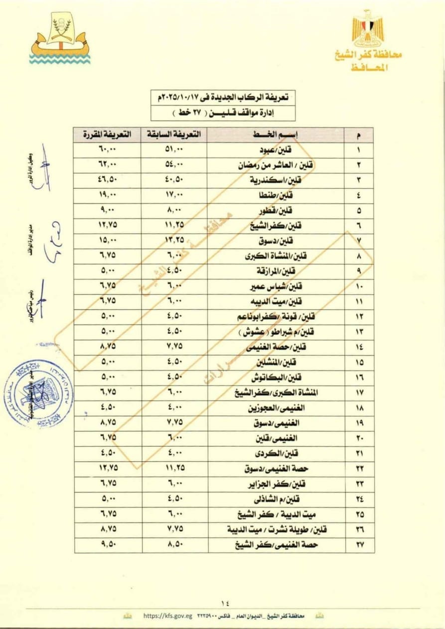 اعتمد اللواء دكتور علاء عبدالمعطي، محافظ كفرالشيخ، اليوم الجمعة، التعريفة الجديدة لنقل الركاب على جميع خطوط المواصلات العامة، الداخلية والخارجية، بنطاق المحافظة، وذلك عقب قرار لجنة التسعير التلقائي للمنتجات البترولية بوزارة البترول بتحريك أسعار المنتجات البترولية اعتبارًا من اليوم، محذرًا من استغلال المواطنين أو تحصيل أي مبالغ إضافية تتجاوز التعريفة الرسمية المقررة.