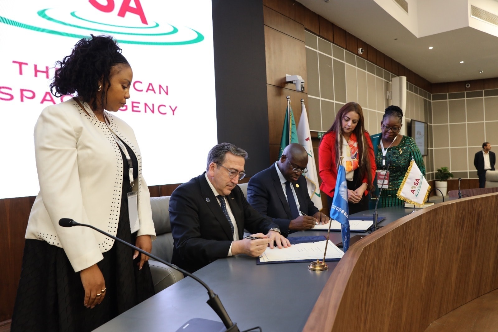 الفريق أول محمود فؤاد عبد الجواد، قائد القوات الجوية المصرية؛ممثلا للسيد القائد العام وزير الدفاع والانتاج الحربي، السيد ماريو أوغوستو دي سيلفا أوليفيرا، وزير الاتصالات وتكنولوجيا المعلومات والاتصال الاجتماعي بجمهورية أنغولا؛ والأستاذ الدكتور أرسين توكا كوبيا، رئيس ديوان وزارة التعليم العالي والبحث العلمي بجمهورية كوت ديفوار، الدكتور تيدياني أوتارا، رئيس المجلس الأفريقي للفضاء.