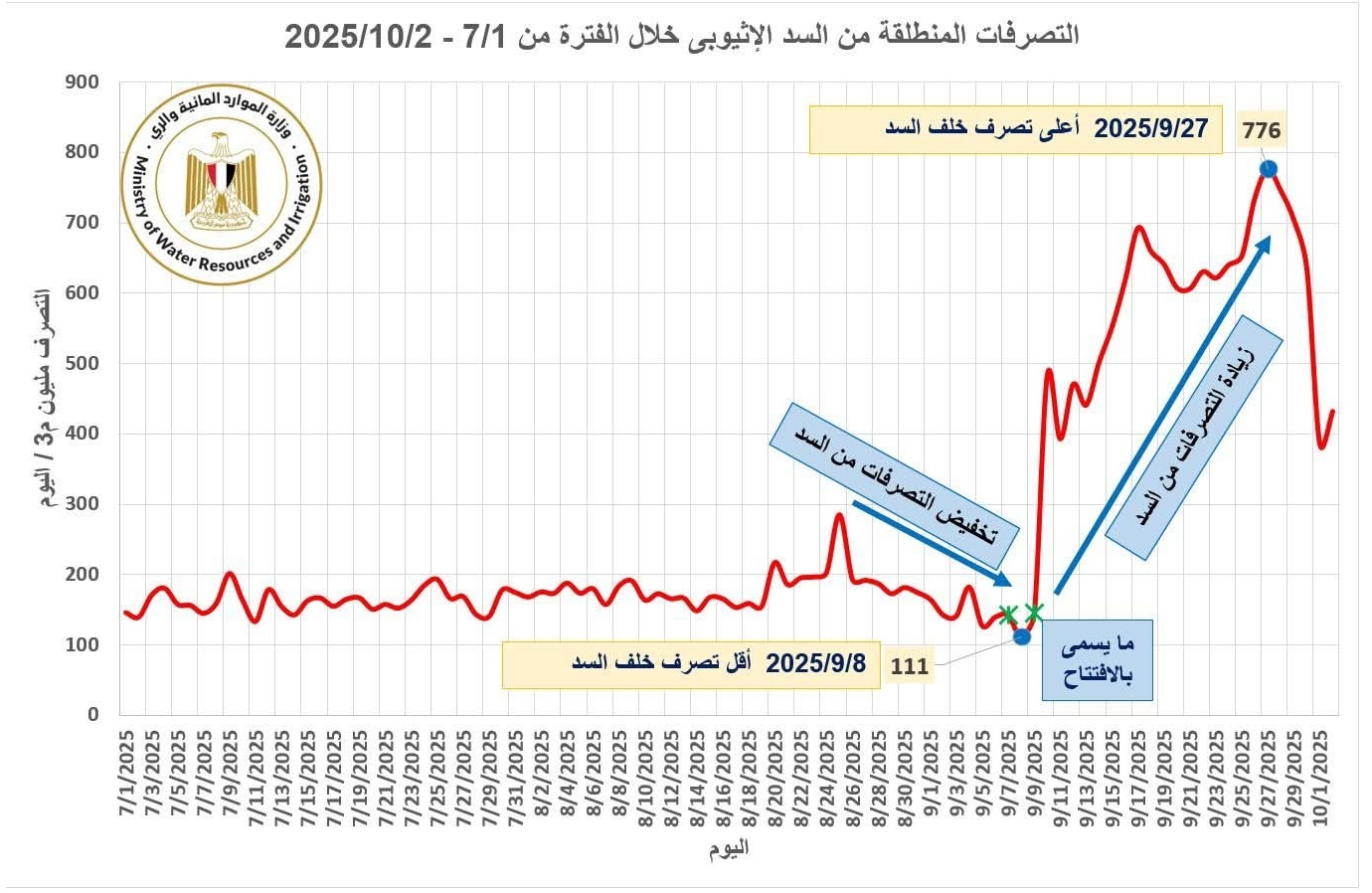 4. غير أنه في نهاية أغسطس لوحظ أن مشغلي السد الإثيوبي خالفوا القواعد الفنية والعلمية المتعارف عليها، حيث قاموا بتخزين كميات أكبر من المتوقع من مياه الفيضان مع تقليل التصريفات من نحو 280 مليون م³ إلى 110 ملايين م³ يوم 8 سبتمبر 2025. وتدل هذه التصرفات على توجه إثيوبي متعجل نحو إتمام الملء بصورة غير منضبطة، بغرض الوصول إلى منسوب 640 متر فوق سطح البحر، ثم فتح المفيض الأوسط ومفيض الطوارئ لساعات معدودة لاستخدامها فقط كـ"لقطة إعلامية" واستعراض سياسي في ما سُمّي باحتفال افتتاح السد يوم 9 سبتمبر 2025، بعيداً عن أي اعتبار للسلامة المائية أو مصالح دول المصب.