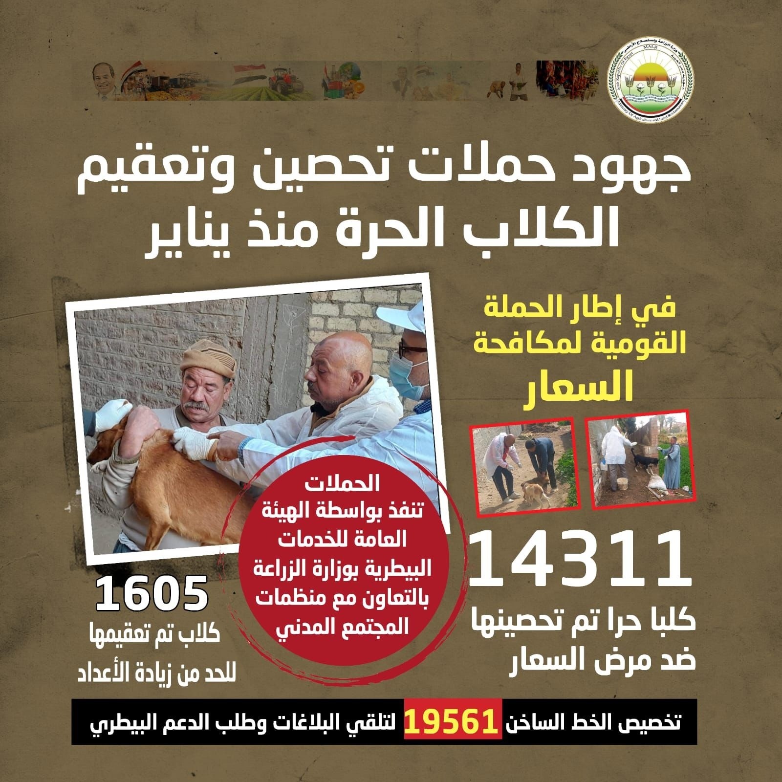 تواصل وزارة الزراعة واستصلاح الأراضي، ممثلة في الهيئة العامة للخدمات البيطرية، بالتعاون مع منظمات المجتمع المدني، تنفيذ الحملة القومية لمكافحة السعار، حيث تم تحصين 14311 كلبًا حرًا منذ بداية يناير، ضمن خطة علمية للحفاظ على صحة الحيوانات والبشر معًا.