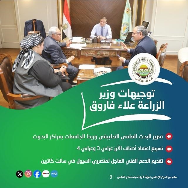 وأكد علاء فاروق وزير الزراعة واستصلاح الأراضي أهمية التوسع في البحوث التطبيقية التي تخدم المزارع بشكل مباشر مع ضرورة تكاملها مع الجامعات موجها بتقييم سلالات عرابي من الأرز والقمح المقاومة للملوحة والجفاف وسرعة الانتهاء من اعتماد أصناف الأرز عرابي 3 وعرابي 4 لرفع إنتاجية المحاصيل الاستراتيجية ودعم الأمن الغذائي.