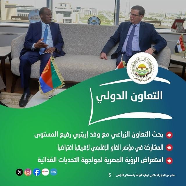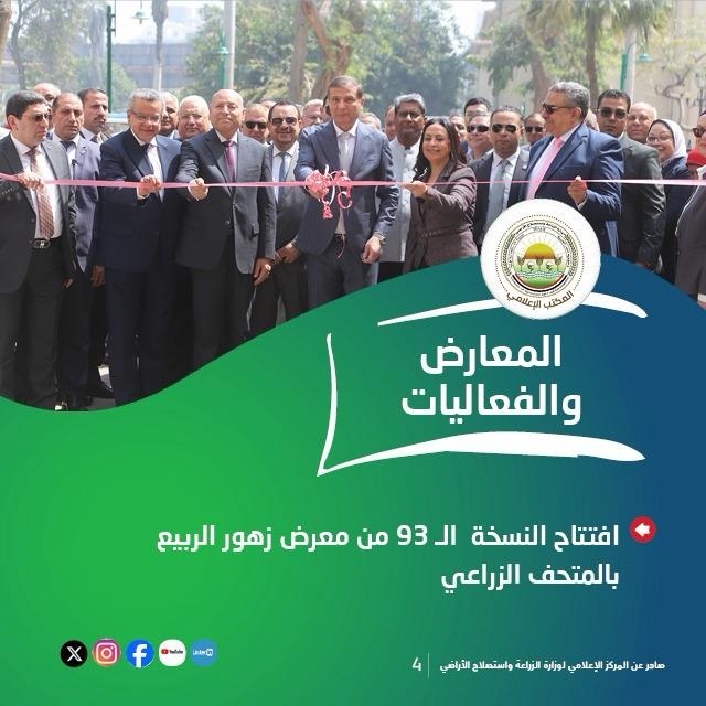 وشهد الأسبوع افتتاح النسخة 93 من معرض زهور الربيع بالمتحف الزراعي بالدقي بحضور رسمي ودبلوماسي واسع ومشاركة أكثر من 100 عارض من كبرى الشركات حيث أكد الوزير أن التوسع في إنتاج نباتات وزهور الزينة يمثل مصدرا مهما للعملة الصعبة. وفي ملف العلاقات الخارجية استقبل وزير الزراعة وفدا إريتريا رفيع المستوى لبحث سبل تعزيز التعاون المشترك في القطاع الزراعي والأنشطة المرتبطة به بما يدعم الشراكة بين البلدين.