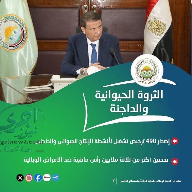 وفي قطاع الثروة الحيوانية أعلنت الوزارة تحصين أكثر من 3 ملايين رأس ماشية ضمن الحملة القومية ضد الجلد العقدي وجدري الأغنام بما يعزز الوقاية وحماية الإنتاج الحيواني.