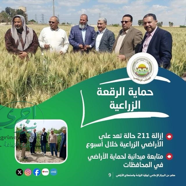 ميدانيا كثفت الوزارة جهودها الرقابية حيث نجحت في ضبط محل بالقليوبية ينتحل صفة الوزارة ويبيع لحوما غير صالحة كما واصلت حملات إزالة التعديات على الأراضي الزراعية والتي أسفرت عن إزالة 211 حالة خلال أسبوع منها 207 حالات في المهد، وفي إطار دعم الصادرات ورفع كفاءة منظومة سلامة الغذاء أعلنت الوزارة رفع القدرة الاستيعابية للمعمل المركزي لمتبقيات المبيدات إلى 400 ألف عينة سنويا بعد التعاقد على أجهزة حديثة كما استقبل المعمل وفدا من شركات الصناعات الغذائية لتعزيز التعاون.