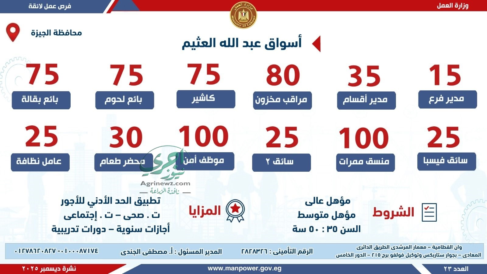 وفيما يخص شركة أسواق عبد الله العثيم ومحال «وإن للمنتجات الغذائية» بمنطقة المعادي، فقد تم الإعلان عن عدد كبير من الوظائف المتنوعة، من بينها: (15) مدير فرع بخبرة 5 سنوات، و(15) مدير أقسام بخبرة 3 سنوات، و(30) موظف كاشير، و(80) عامل مخازن، و(75) بائع لحوم، و(75) بائع دواجن، و(75) بائع ألبان، و(30) جزار، و(25) خباز فطير، و(25) طباخ وجبات جاهزة، و(100) عامل خدمات، و(25) عامل مخبز، و(36) عامل إنتاج، و(16) مشرف أمن، و(16) عامل نظافة، بالإضافة إلى (50) عامل نظافة فروع. وتشترط الشركة مؤهلًا عاليًا أو فوق متوسط أو متوسط، وسن المتقدم من 18 إلى 50 عامًا، مع توفير برامج تدريب وفرص للترقي وتجديد الخبرات،مع الالتزام بتطبيق الحد الادنى للأجور .. وللتواصل عبر الأرقام: 01000871774 – 01278620827 – 01000850351.