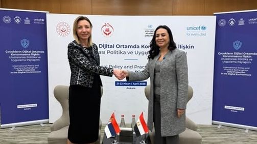 التقت الدكتورة مايا مرسي وزيرة التضامن الاجتماعي، السيدة تانجانا ماكورا وزيرة المساواة بين الجنسين والوقاية من العنف ضد النساء والتمكين الاقتصادي والسياسي للنساء بجمهورية صربيا، وذلك على هامش مشاركتها في اجتماع المائدة المستديرة حول "تبادل السياسات والممارسات الدولية بشأن حماية الطفل في البيئة الرقمية" بأنقرة، بحضور الأستاذة دينا الصيرفي مساعدة وزيرة التضامن الاجتماعي للتعاون الدولي والعلاقات والاتفاقات الدولية.