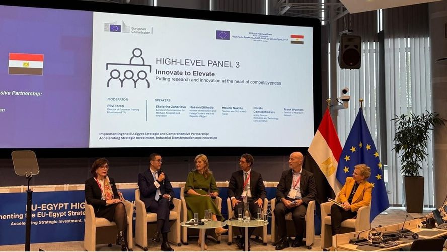 في إطار فعاليات القمة المصرية الأوروبية ببروكسل حول تعزيز القدرة التنافسية والابتكار الصناعي، شارك المهندس حسن الخطيب، وزير الاستثمار والتجارة الخارجية في الجلسة الرفيعة المستوى بعنوان "ابتكر لترتقي: وضع البحث والابتكار في قلب القدرة التنافسية"، وأدارت الجلسة السيدة بيلفي تورستي، مديرة المؤسسة الأوروبية للتدريب، وبحضور السيدة إيكاترينا زاهاريفا، المفوضة الأوروبية لشؤون الشركات الناشئة والبحث والابتكار، و منير نخلة، مؤسس و الرئيس التنفيذي MNT-Halan، و السيدة نورِيلا كونستانتينسكو، القائم بأعمال مدير مركز الابتكار والتكنولوجيا بالوكالة الدولية للطاقة المتجددة (IRENA)، وفرانك ووترز، مدير شبكة EU MED-GEM الممولة من الاتحاد الأوروبي