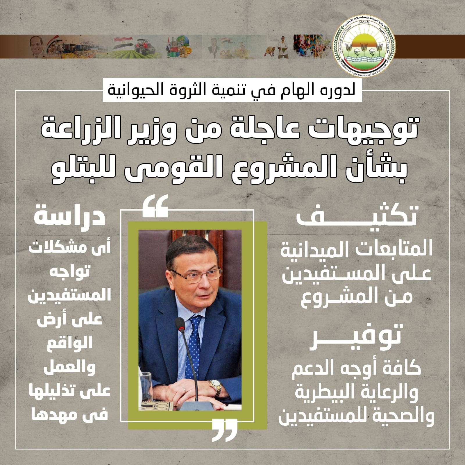 وكلف "فاروق" قطاع تنمية الثروة الحيوانية والداجنة والهيئة العامة للخدمات البيطرية بالتنسيق مع مديريات الزراعة والطب البيطرى على مستوى محافظات الجمهورية بتكثيف المتابعات الميدانية على المستفيدين من المشروع القومى للبتلو، مع توفير كافة أوجه الدعم والرعاية البيطرية والصحية ودراسة أى مشكلات تواجه المستفيدين على أرض الواقع والعمل على تذليلها فى مهدها.